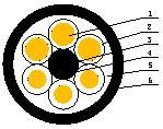 1、鍍錫軟銅導體 2、乙丙絕緣層 3、中心加強件 4、加強件緩沖護層 5、乙丙內護填充 6、TPU加強外護層